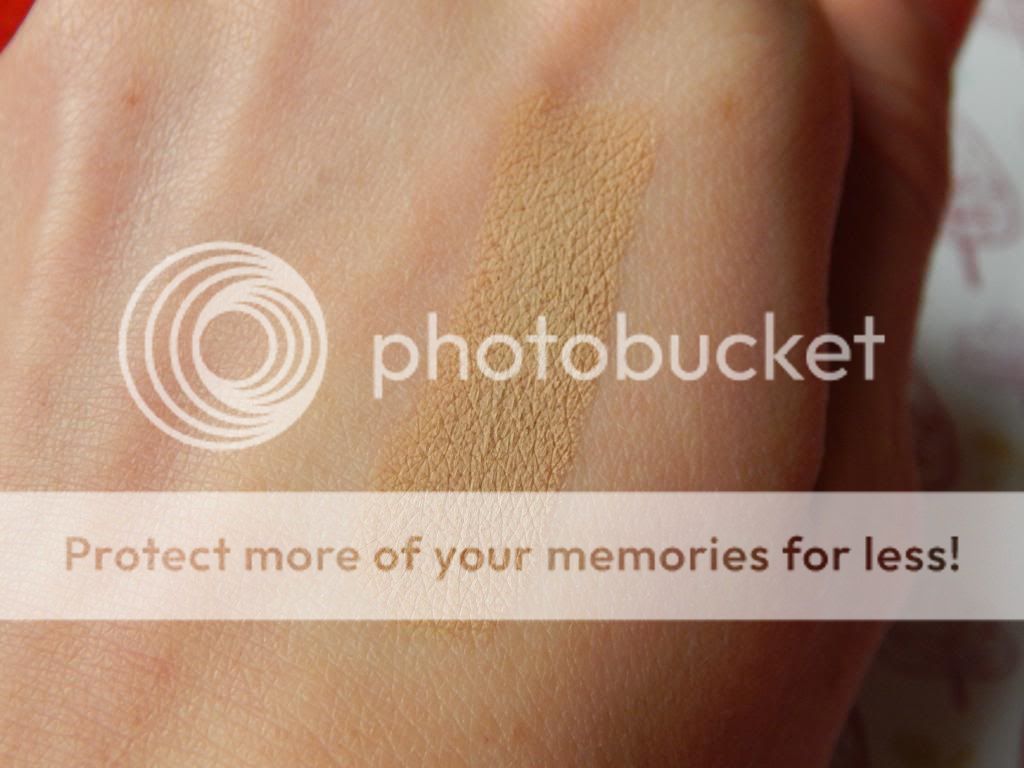 Hier zie je de coverstick zelf en ook de swatchen, zoals je ziet is de kleur vrij oranje maar als je het meer uitveegt en in je gezicht blendt ziet er het lichter uit.